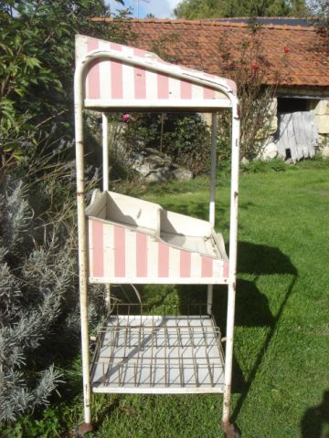 bathroom. The trolley is on little wheels and has a very attractive pink